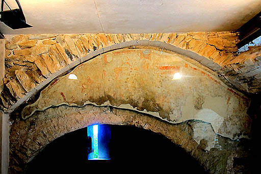 In den Wänden erkennt man noch Einstecklöcher für die Balken von Zwischendecken. Die Wände und vor allem die Decken sind optisch ansprechend mit den Bruchsteinen gestaltet. |